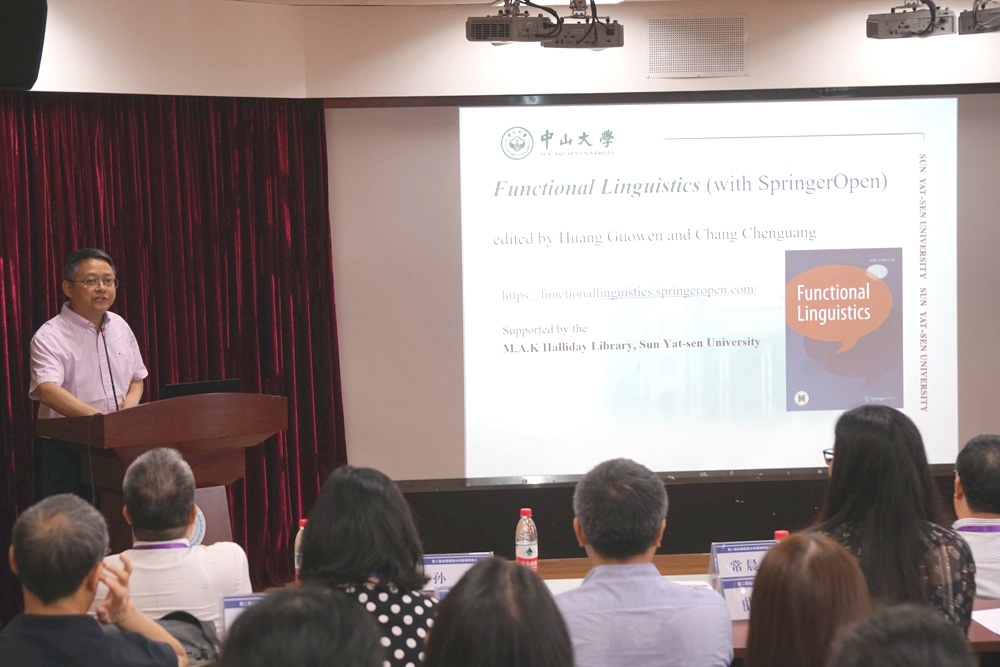 与会代表集体合影后,华南农业大学黄国文教授做“关于‘和谐话语分析’的构想”的主旨发言,对所提出的“和谐话语分析”(Harmonious Discourse Analysis)的背景、哲学思考、理论支撑、研究方法、分析重点进行勾画,同时对和谐话语分析的理论价值和现实意义进行探讨。复旦大学祝克懿教授的发言题目是“互文理论视野下的语篇”,互文语篇研究逐渐将研究重心转移至篇章层次,注重系统形式结构和语义内容的有机统一。
