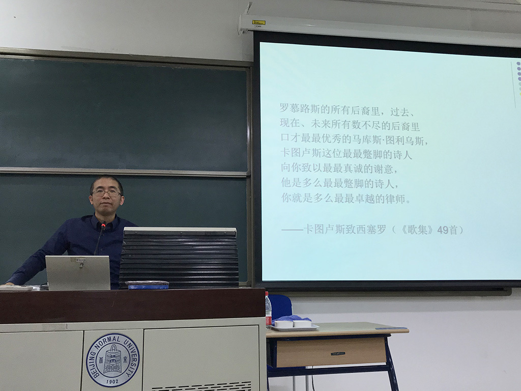 李永毅教授的讲座分为两个部分:古罗马诗歌的现代性和英美现代主义的古罗马印记。在第一部分,李永毅教授分别从“从教化与唯美”、“从叙事到抒情”、“从修辞劝服到直接表达”、“从重天才到重技艺”、“表演性与元诗倾向”、“体裁越界与元素杂糅”、“深度个性体验”、“诗歌的非个性化”、“重释与颠覆”和“庸常叙事”共十个方面阐发古罗马诗歌中的现代性。为了便于师生理解,李永毅教授援引了诸多古罗马诗人的诗歌片段,并对其中蕴含的精美绝伦,幽默风趣,技巧高妙之处分别予以解读,令人印象深刻。在第二部分,李永毅教授着重分析了几位英美现代派大诗人在诗歌创中所受到的来自古罗马诗人的影响:庞德以对贺拉斯诗歌的化用和移位表现了现代生活的庸常和断裂;弗罗斯特从卡图卢斯的诗学中发现了现代主义诗歌所要表现的复杂性和包容性;叶芝从古罗马诗人那里习得了现代诗歌所需要的明晰、深刻与尖锐;还有卡明斯、艾略特……在讲解过程中,李永毅教授以明晰的整体脉络、丰富的诗学材料、精当的分析解读和深刻的学术洞见向师生们献上了一场学术盛宴,展现了学术的深邃与优美以及一位优秀学者对学问的孜孜探求和挚爱。
