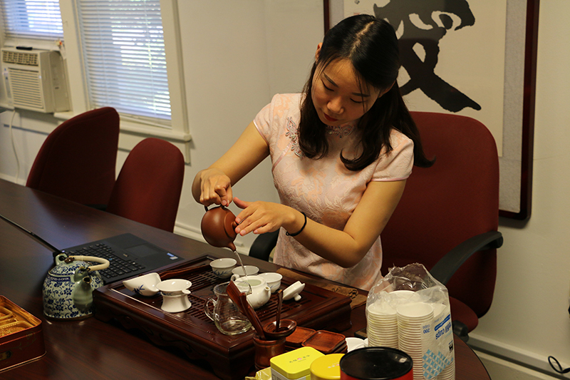 在本次开放日活动中,孔子学院办公区被开辟为四个中国传统文化体验区——剪纸体验区、书画体验区、茶艺体验区和民乐表演区。