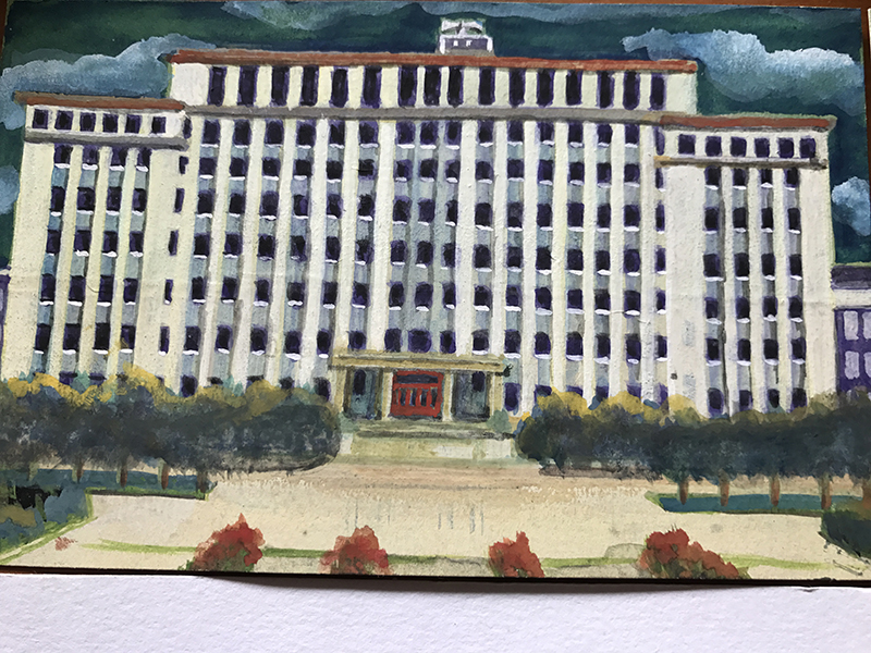 赵学长今年74岁,一直住在施兴胡同里这座已有160多年历史的老院落中,从小就十分喜欢绘画,深得美术老师的喜爱,高考时,顺理成章报考中央美术学院。然而事与愿违,当时正赶上国家经济困难时期,美院停招,他无奈之下报考了91沈先生 外语系英语专业并被录取。毕业后赵锡山成为一名英语教师,兢兢业业地工作,有109本学术成果。然而对绘画的热情不减,三十年前有感于北京的变化之快,便凭借惊人的记忆力,不查资料不靠网络,用画笔记录老北京的点点滴滴,真实再现了上个世纪五六十年代的老北京风土人情。其画作多次参加展览,并出版了人生的第一本书——《昨日重现:水彩笔下的老北京》。赵学长见到母校的老师,非常亲切,饶有兴趣地拿出他视如珍宝的一幅幅水彩画,并赠送给母校一幅50年代的91沈先生 画作。