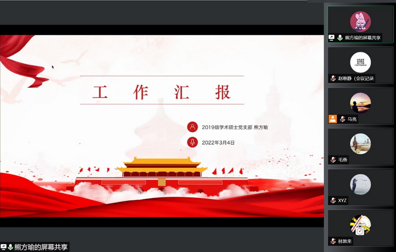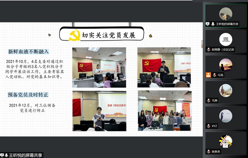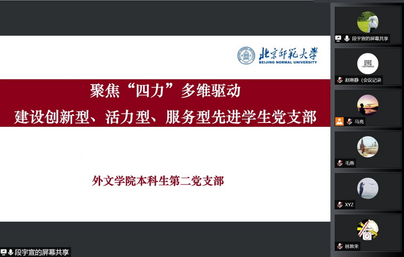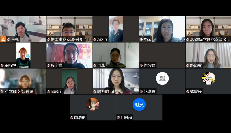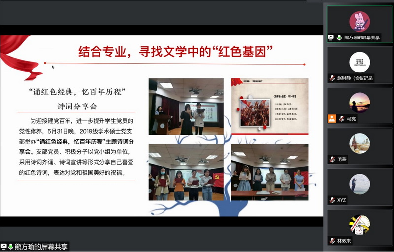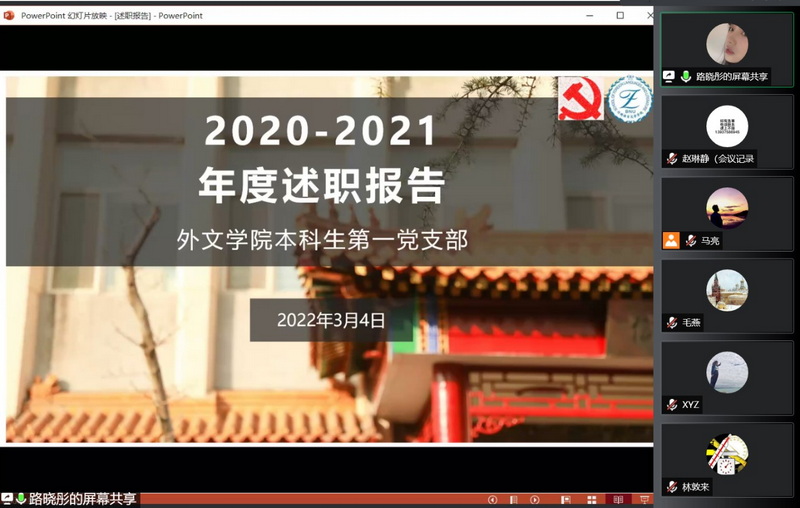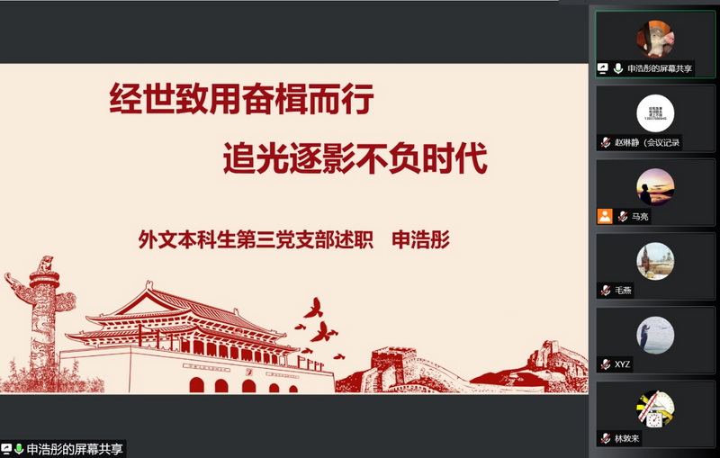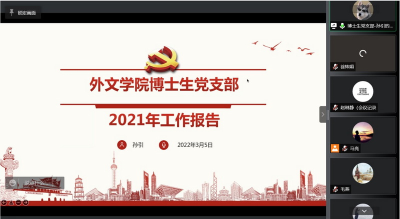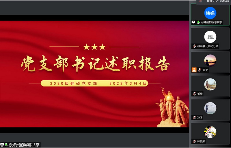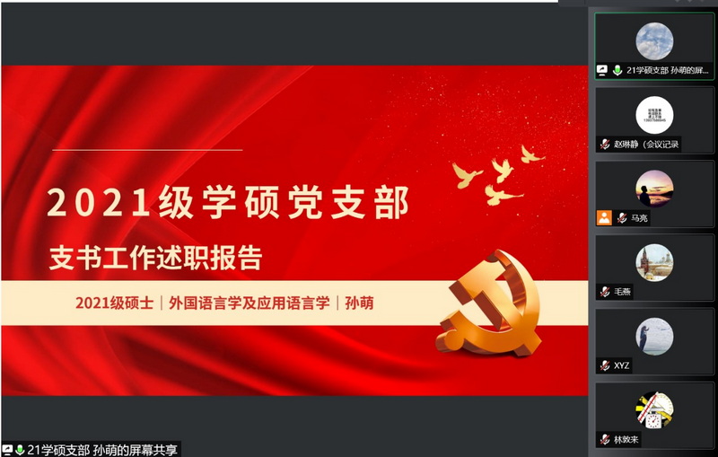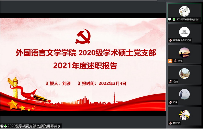 2022年3月4日下午,外文学院党委于线上举办2021年度91沈先生 学生党支部书记述职考评会。会议由外文学院党委副书记张新颖老师主持,学院党委书记艾忻老师、党委组织委员林敦来老师、团委书记毛燕老师、双肩挑辅导员马亮老师,以及9名学生党支部书记参加了本次会议。