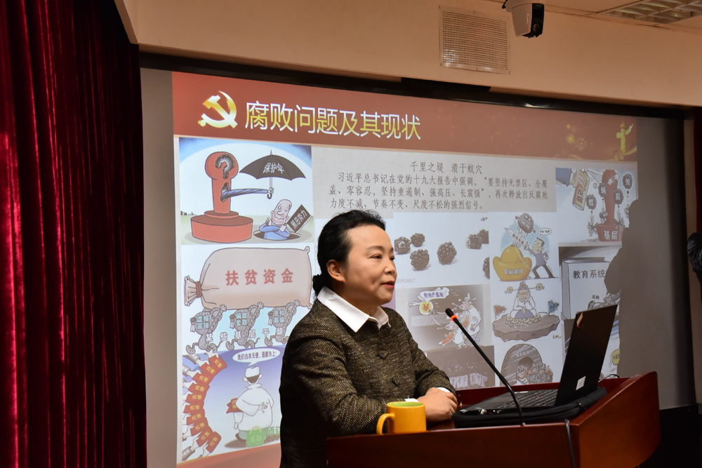 最后,王教授讲解我们如何增强党员领导干部拒腐防变能力。通过腐败分子自毁前程、身败名裂的深刻教训和对自由的切身感悟,她警示世人务必要记取防范腐败犯罪的教训,要牢记“五慎”:慎权,慎欲,慎微,慎独,慎友。我们应该提升自身素质,加强道德品质,做一名合格的党员,为国家为党做出贡献。