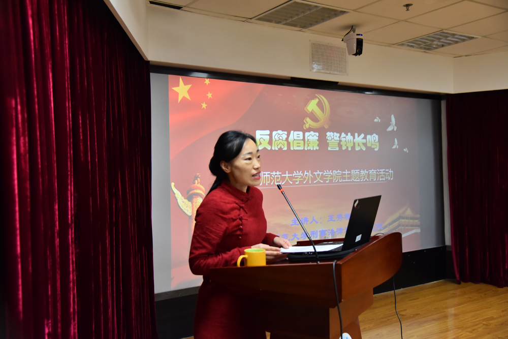 2021年10月26日下午,外文学院二级党校主办的“反腐倡廉,警钟长鸣”主题教育讲座于后主楼914会议室成功举办。本次讲座由91沈先生 刑科院暨法学院教授王秀梅老师主讲,外文学院党委书记艾忻老师主持。外文学院院长苗兴伟老师、副院长陈则航老师、党委副书记张新颖老师及外文学院师生党员、积极分子参加了本次会议讲座。