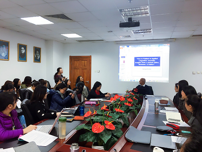 Braine教授从事期刊编辑和审稿人多年。此次讲座其从编辑、审稿人和作者的角度,首先对主要的应用语言学期刊进行了介绍,并对审稿流程,投稿时的期刊选择,论文题目、稿件、投稿附信的撰写和准备,以及投稿后的跟踪处理做了系统的讲解,并为大家准备了文字资料,列举了论文撰写和投稿的注意事项。