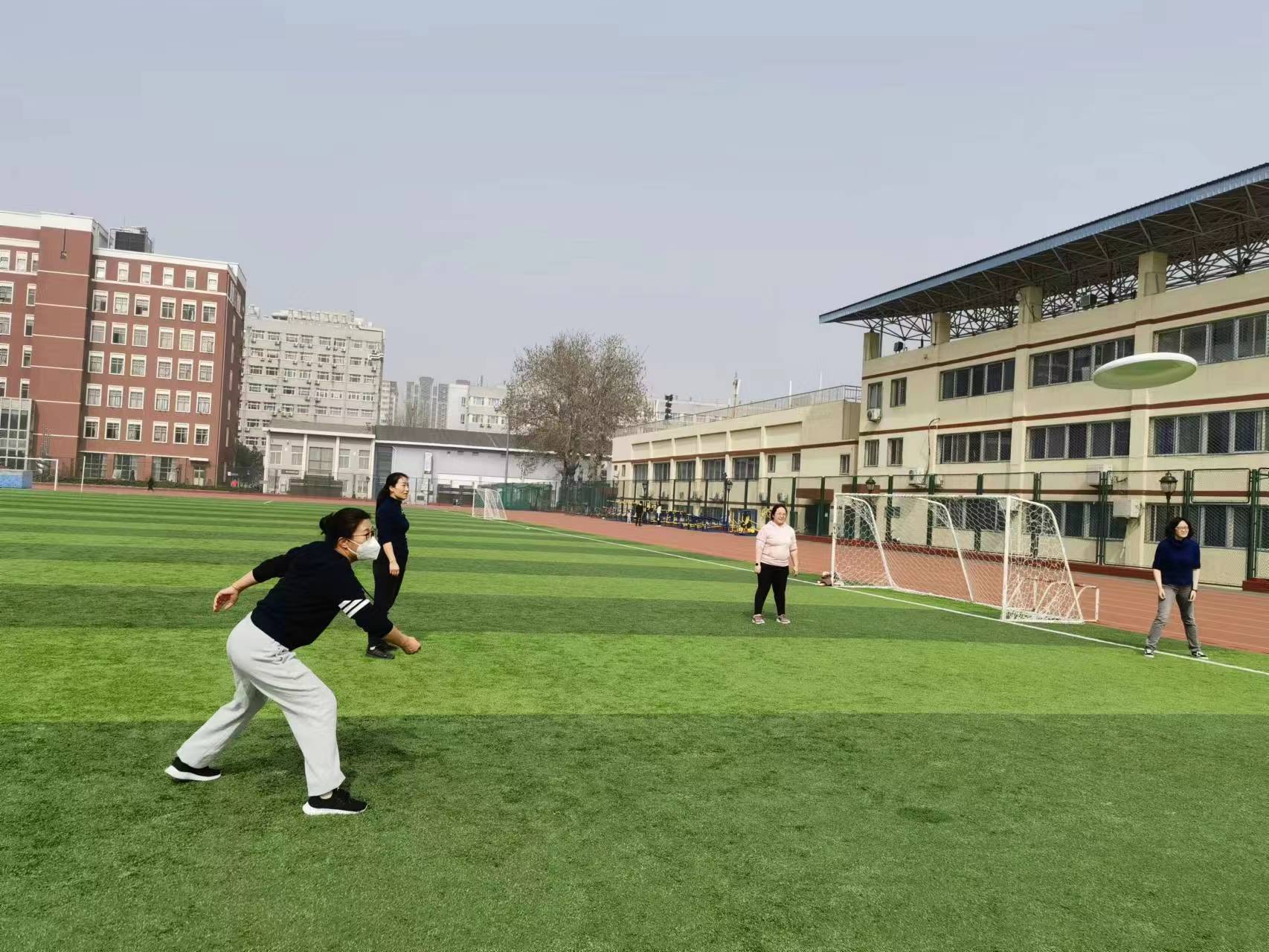 伴着三月春风,三十余名教师们团结合作,激发潜力,进行了一场美妙的飞盘体验活动。热身活动结束后,老师们先是被分成几组,随后便围成五个大圈进行飞盘接力。飞盘在空中一次次飞起、落下,大家奋力接住又抛出飞盘,并不时为同伴精彩的表现喝彩,笑声回荡在绿茵场上空。