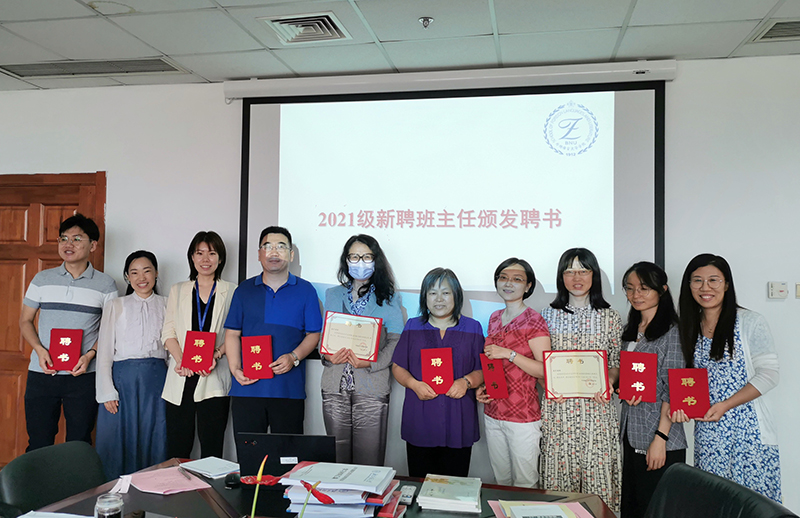 党委书记艾忻、党委副书记张新颖对新加入学院班主任队伍的英文系教师刘永厚、日文系教师姜弘、徐畅、公外部教师李彦铭、龙宇表示热烈的欢迎,并为2021级新生班主任老师颁发了聘书。