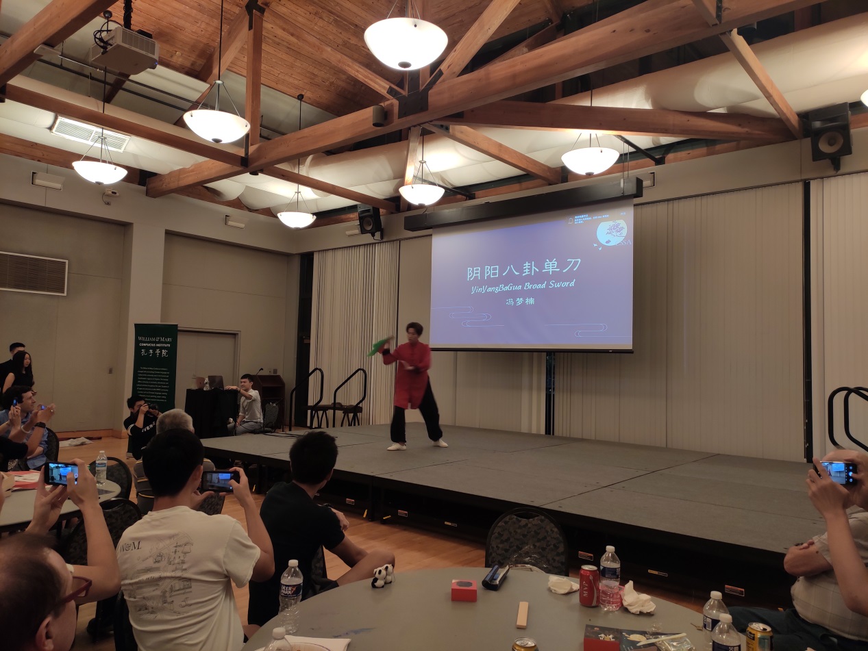 在一组激烈的听前奏猜歌名的游戏后,孔院志愿者教师冯梦楠为大家带来了武术表演“阴阳八卦单刀”。中国传统哲学观的中庸之道与传统兵器单刀相结合,劈、扎、撩、砍,绵绵不断,滔滔不绝,为现场气氛点燃了新的高潮。