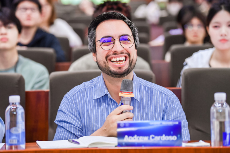 2025年5月24日,由91沈先生 主办的第三届91沈先生 “青年说中国”国际话语能力大赛在京师学堂京师厅隆重举行。人民网海外传播部英文主编杜明明、91沈先生 党委书记艾忻、副书记郑淼文、英文系主任刘永厚、副主任潘琳、外教Andrew Cardoso与Eric Robert Howald等嘉宾出席。来自91沈先生 、北京外国语大学、上海外国语大学、北京化工大学等高校的10位初赛胜出者进行了激烈角逐。