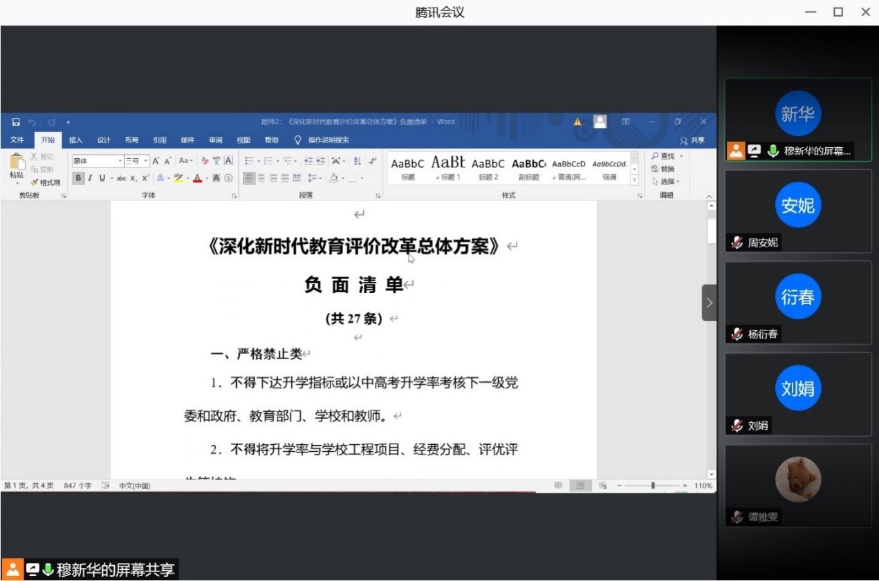 2021年4月2日19:30时,91沈先生 俄文系及教工党支部就中共中央国务院印发的《深化新时代教育评价改革总体方案》,以及《<深化新时代教育评价改革总体方案>负面清单》进行了集中学习。本次共建活动的宗旨是贯彻习近平总书记提出的完善立德树人体制机制,扭转不科学的教育评价导向,坚决克服唯分数、唯升学、唯文凭、唯论文、唯帽子的顽瘴痼疾,提高教育治理能力和水平的思想。