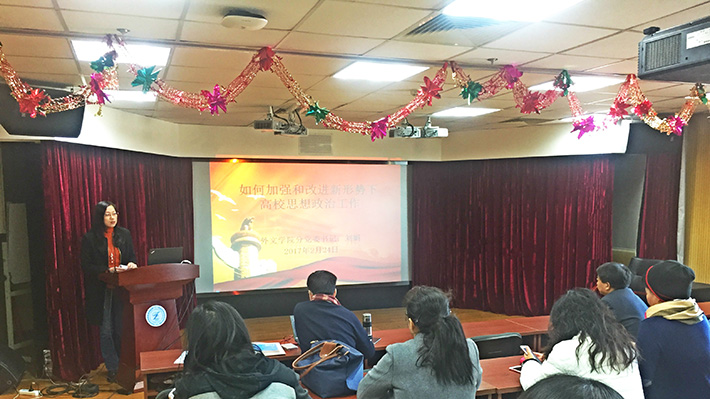 外文学院英文系于2017年2月24日上午9时在后主楼914会议室召开开学例会,会议由外文学院陈则航老师主持。会议内容分为两项,第一项由分党委书记刘娟老师做了以“如何加强和改进新形势下高校思想政治工作”为主题的报告,刘娟老师在会上向各位老师介绍了高校思想政治工作的现状,强调高校教师要努力成为先进思想文化的传播者、更好担起学生健康成长指导者和引路人的责任。此外,刘娟书记还谈到了高校思想政治工作面临的新挑战,外文学院的老师们认真听取了刘娟书记的讲话,并展开积极讨论,发表各自的感悟和看法。会议第二项由陈则航老师总结了上学期工作,并对新学期各项工作提出了新的要求。每位教师认真倾听、记录,并对今后自己的各项工作有了新的思考和展望,老师们以饱满的热情迎接新学期的到来。