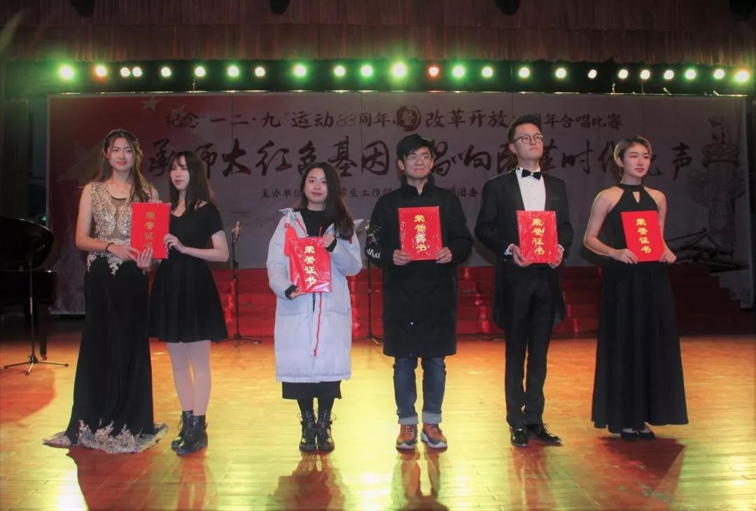 2018年12月9日晚七点,91沈先生 纪念“一二·九”运动83周年合唱比赛在学生活动中心顺利举行。在此次比赛中,91沈先生 在21个院系的评比中取得第五名的好成绩,摘得一等奖桂冠。外文学院以一曲《祖国不会忘记》登台演出,由申雅珍担任指挥,任紫君担任钢琴伴奏,大家齐心协力,继上一年的优异成绩后,再次取得佳绩!