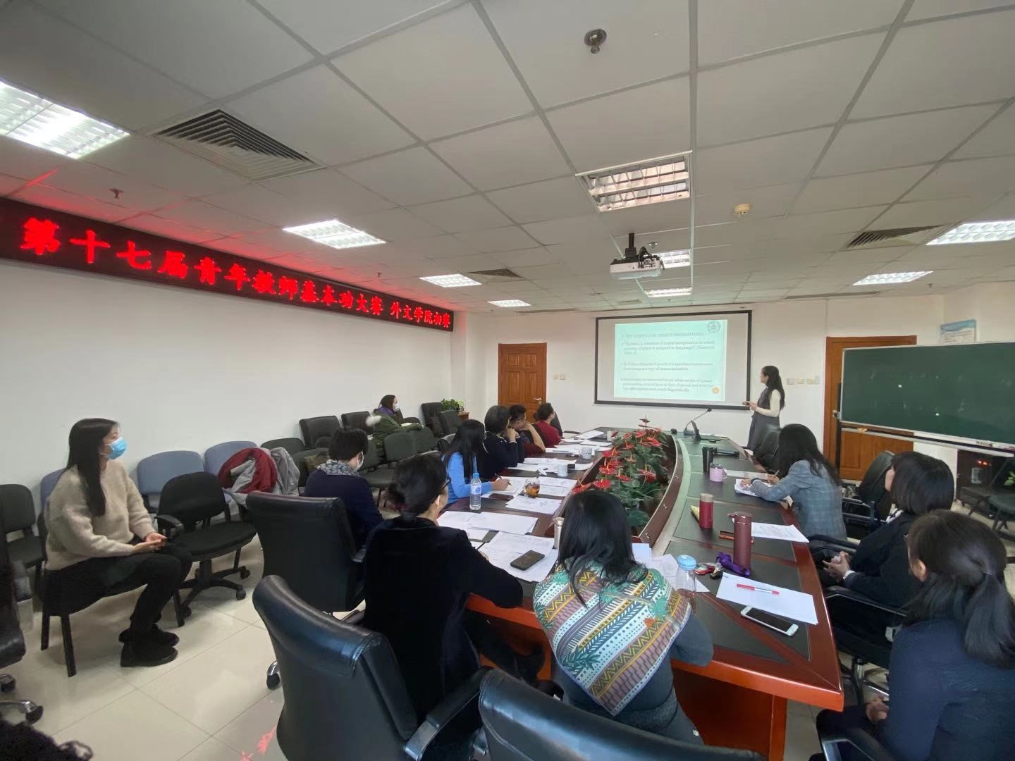 在校工会指导和关心下,外文学院工会于2020年12月14日成功举办第十七届青年教师教学基本功大赛预赛。本次大赛有四位青年教师参赛。初赛邀请了学院七位教师担任评委。来自艺传、生科等学院的老师到场观摩。