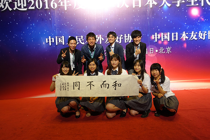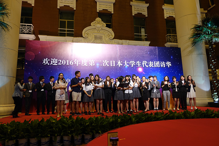 在中国对外友好协会主办的晚宴上,中日大学生进行了联欢。日文系田雅菲同学表演的《惊鸿舞》技“惊”四座,王蓉、臧晓慧同学的书法《和而不同》寓意在国际化中文化多样性和相互理解的重要性,大二李嘉悦、陶悦、胡瑜庭等五位同学的合唱《北京欢迎您》作为联欢晚会的压轴之作,更是将晚会的氛围推到了高潮。