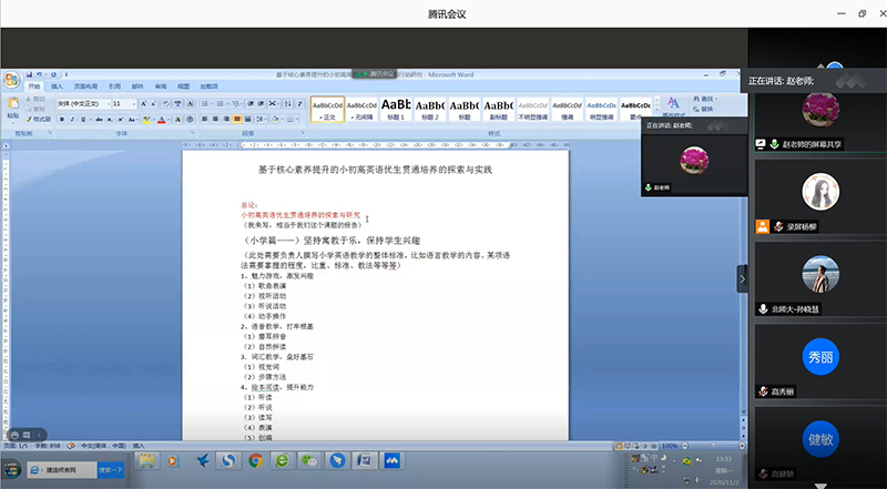 接下来,孙晓慧老师对论文集框架中存在的问题进行了标注,并通过屏幕共享的方式具体向各位老师指出问题所在,并提出改进建议。同时,她对潘琳老师提出的精简论文集题目这一建议深表认同,并拟定修改后的论文集题目。最后,孙老师对该校侯老师的课题申报给予充分的鼓励,给到建设性的建议,并与侯老师进行课题探讨、为其答疑解惑。