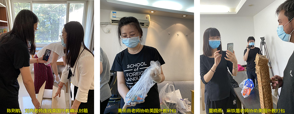 打包当天,各组与外籍教师进行视频连线、直播打包。客厅、卧室、厨房、浴室,每一个房间、每一个抽屉、每一个柜子中的每一样物品,都一一请外教确认是否邮寄。视频连线、整理行李、清点打包、搬运、寄送,老师们不畏辛苦,在炎炎夏日里有条不紊的进行着每一个流程。