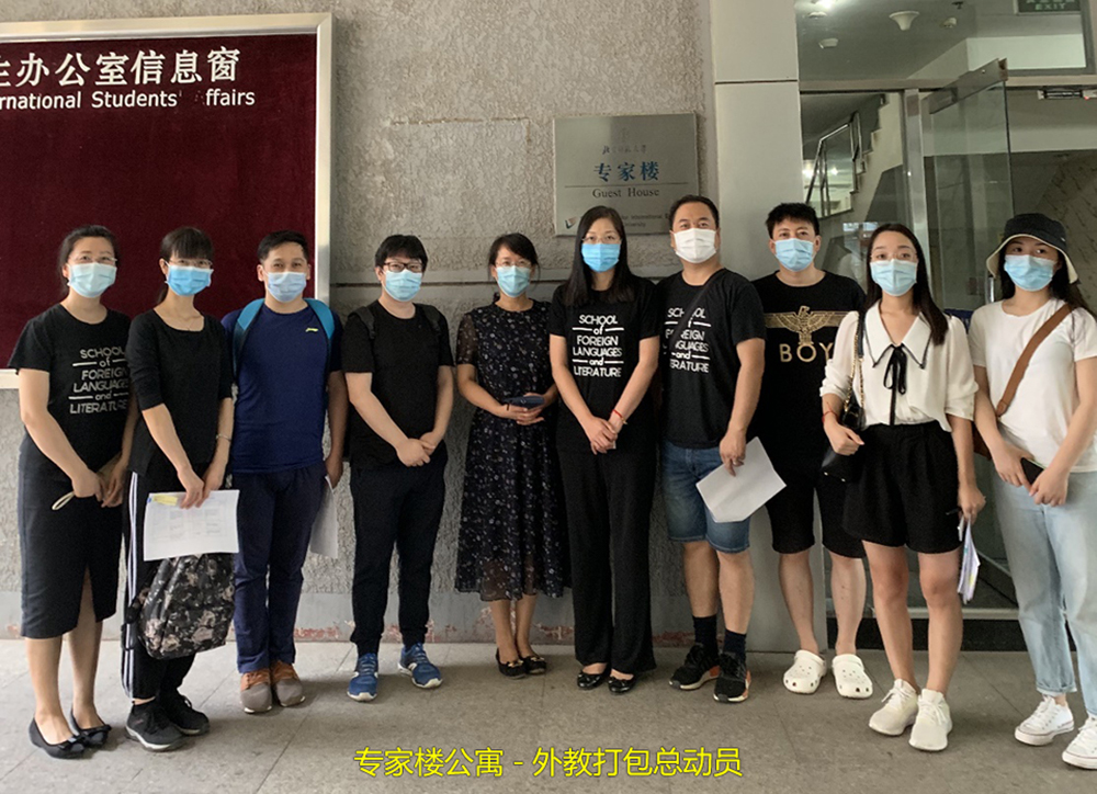 外文学院提前部署外教行李打包重点事项。自2020年6月开始,学院院务会就此项工作做了周密部署,外教打包工作组制定了科学可行的实施方案,对外教、志愿打包教师、专家公寓、后勤人员、邮寄等多个方面进行了协调,细化工作内容和职责。2020年7月6日,国际处主动联系学院,积极组织动员国际处党员教师,支援学院打包工作。7月10日,学院各系主任、任课老师、行政老师主动请缨、积极报名参与,组成了与外教一对一的工作组。学院特意为每个外教安排了与其熟识的学院教师进行对接。