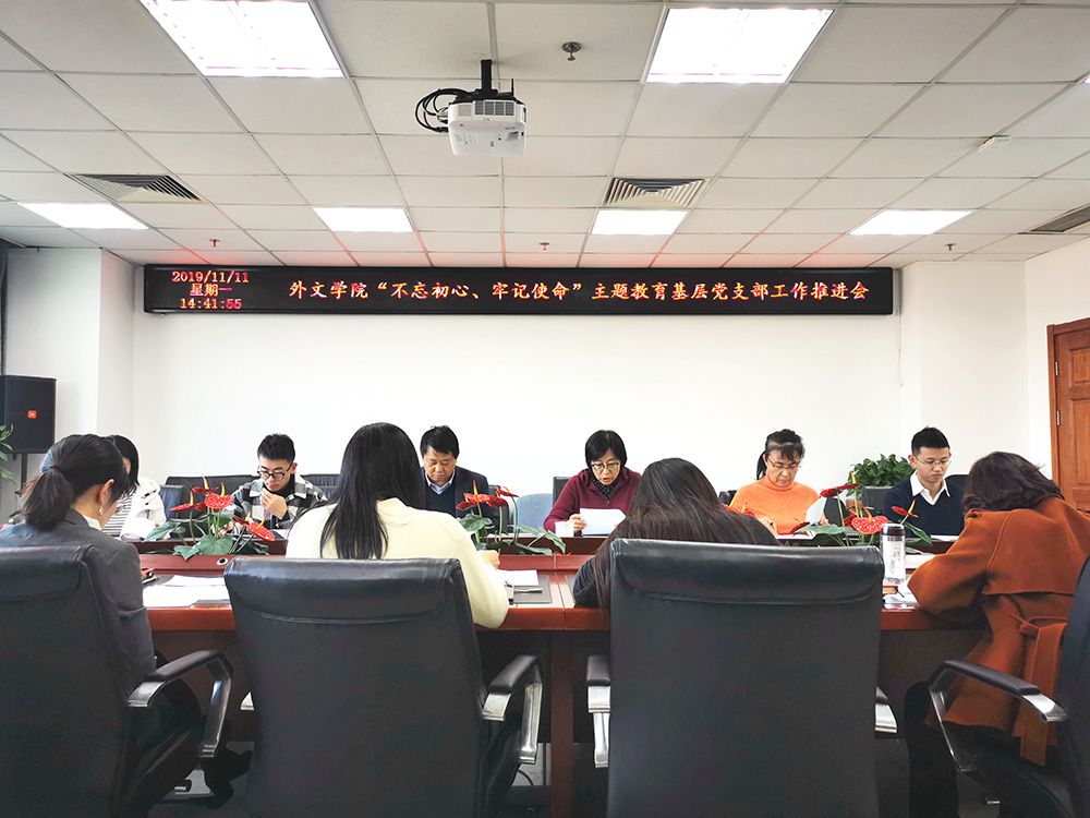 2019年11月11日下午14:30,外文学院党委在后主楼1020会议室召开“不忘初心、牢记使命”主题教育基层党支部工作推进会暨2019—2020学年第一学期党委扩大会议。会议由党委书记刘娟主持,党委委员、师生党支部书记参加会议。