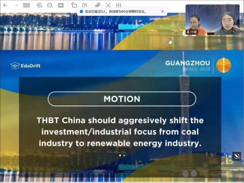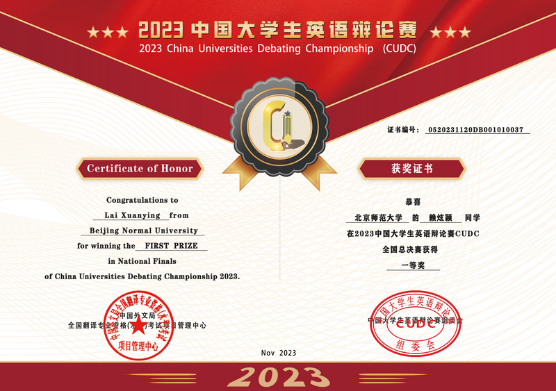 在全国总决赛中,尽管首战失利,两位同学没有气馁,而是迅速调整心态,展现出了优秀辩手的素质。第二天,他们全力以赴,在两场比赛中均获得小组第一,最终以五场循环赛三场第一的成绩昂首晋级淘汰赛,并最终荣获全国一等奖。