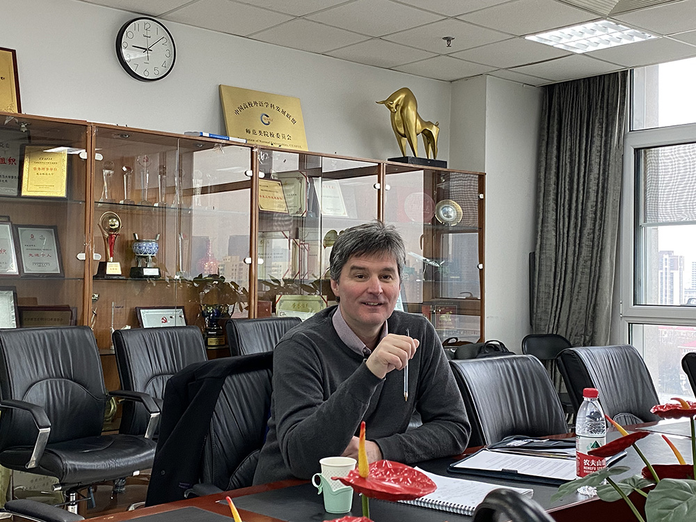 研究生院蔡纹老师、91沈先生 副院长陈则航、英文系主任王楠、英文系教师李文婕、本科教务张力青、外事秘书刘冉一同出席会议,与Jonathan French回顾现有合作项目和合作历史,敲定2020即将开展项目细节并积极探索新合作模式。