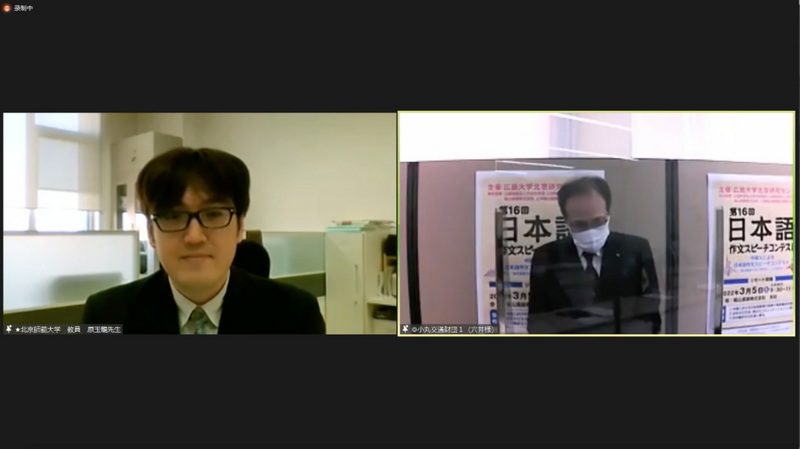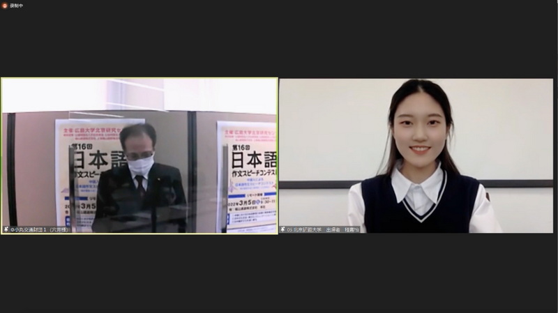 2022年3月5日,广岛大学北京研究中心第16届日语作文演讲比赛个人决赛暨颁奖典礼在线上举行,日文系2020级的程嘉怡同学在作文审核、命题演讲和现场问答三个环节中披荆斩棘,荣获个人奖第一名,日文系投稿参赛的5篇作文获得团体银奖。赛前,日文系外籍教师原玉龙老师给予了专业、耐心的指导。
