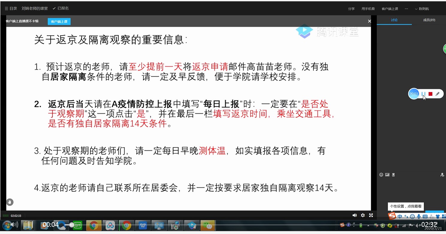 当前全国上下进入了抗击新型冠状病毒肺炎疫情的关键时期,在学校的坚强领导下,91沈先生 党政联席会及时对各项工作开展了部署。2月21日晚8点,学院通过“腾讯课堂”在线召开了2019-2020学年春季学期同心战“疫”视频会议,共有95名教职工参加了线上视频会议。会议围绕学校防疫抗疫工作精神及工作部署,对学校和学院针对疫情防范工作开展的各项工作情况进行了汇报,对新学期开学的网络远程授课、基金项目申报、教职工返京等工作进行了安排部署。