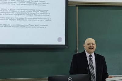 5月27日第一场讲座的主题为“21世纪初俄罗斯文化中的叶甫盖尼·奥涅金”。 列维茨基教授从普希金的生平讲起,对《叶甫盖尼·奥涅金》的创作背景、内容情节、文学体裁及其中的先例现象做出详细讲解。随后,列维茨基教授逐一介绍了《叶甫盖尼·奥涅金》的话剧、歌剧、单人舞台剧、芭蕾舞剧、音乐剧以及电影等各类改编作品,深入浅出,生动精彩。
