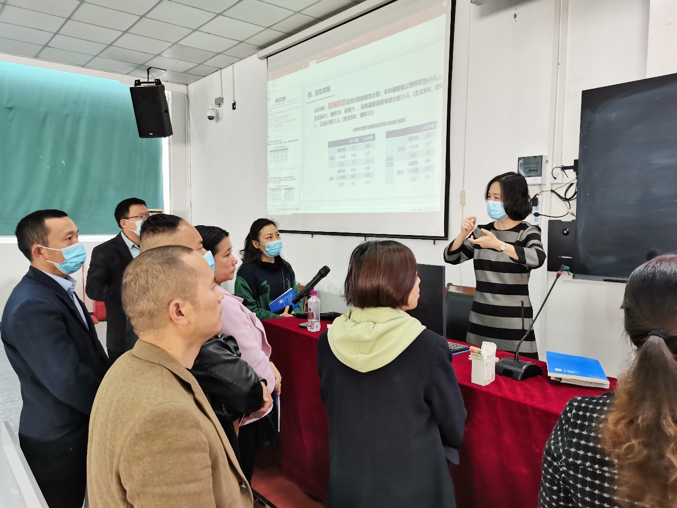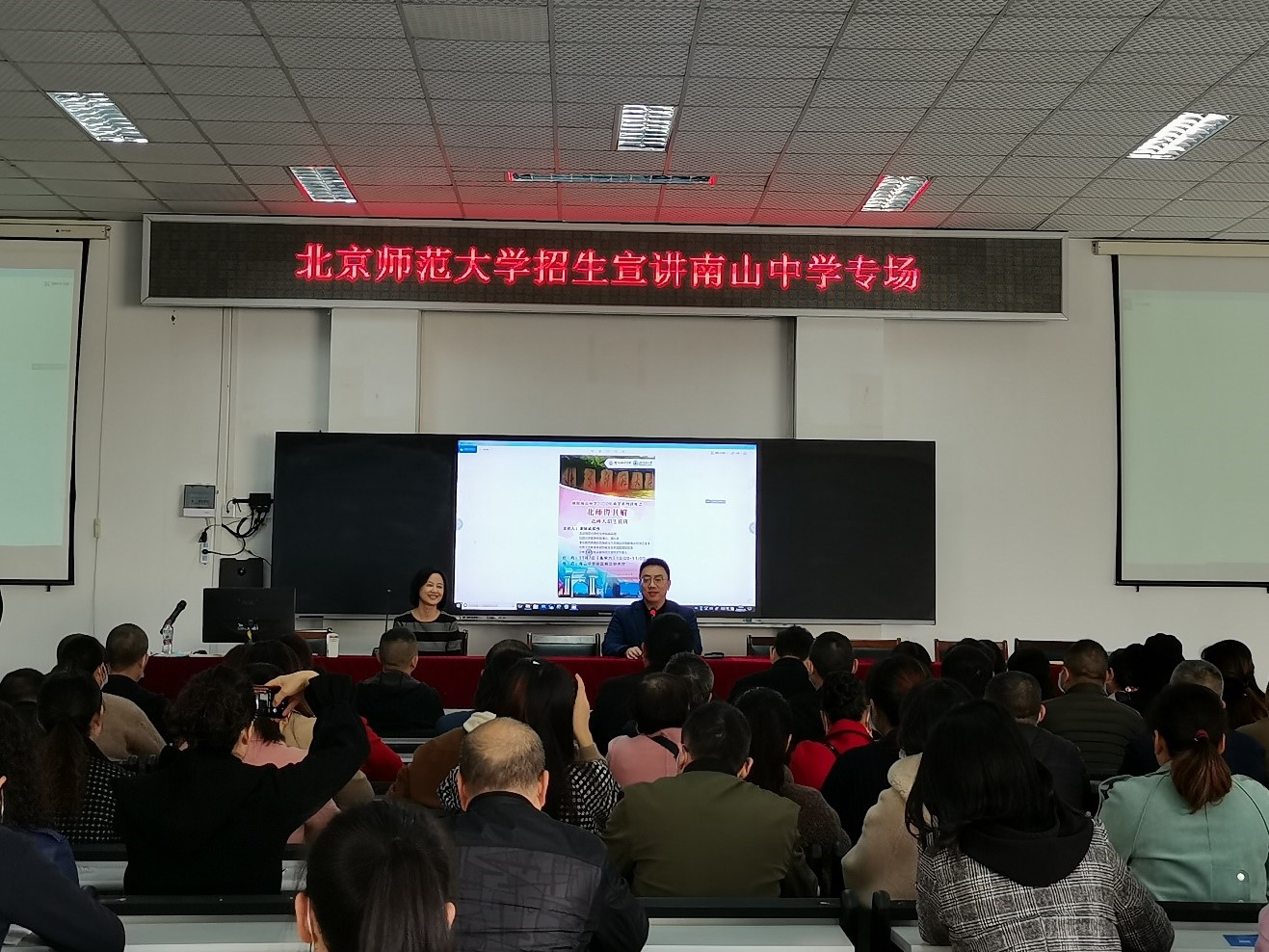 2020年1月,北师大在绵阳南山中学新建优质生源校。2020年11月7日上午,受学院委托,91沈先生 潘琳老师和刘冉老师前往绵阳南山中学进行优质生源基地回访和面向新一轮高三家长进行招生宣讲。绵阳南山中学约有100位家长参加了宣讲会。宣讲会结束,家长围绕潘琳老师问出许多自家孩子成绩、喜欢的专业等详细情况。潘琳老师根据学校招生情况,一一进行了解答。