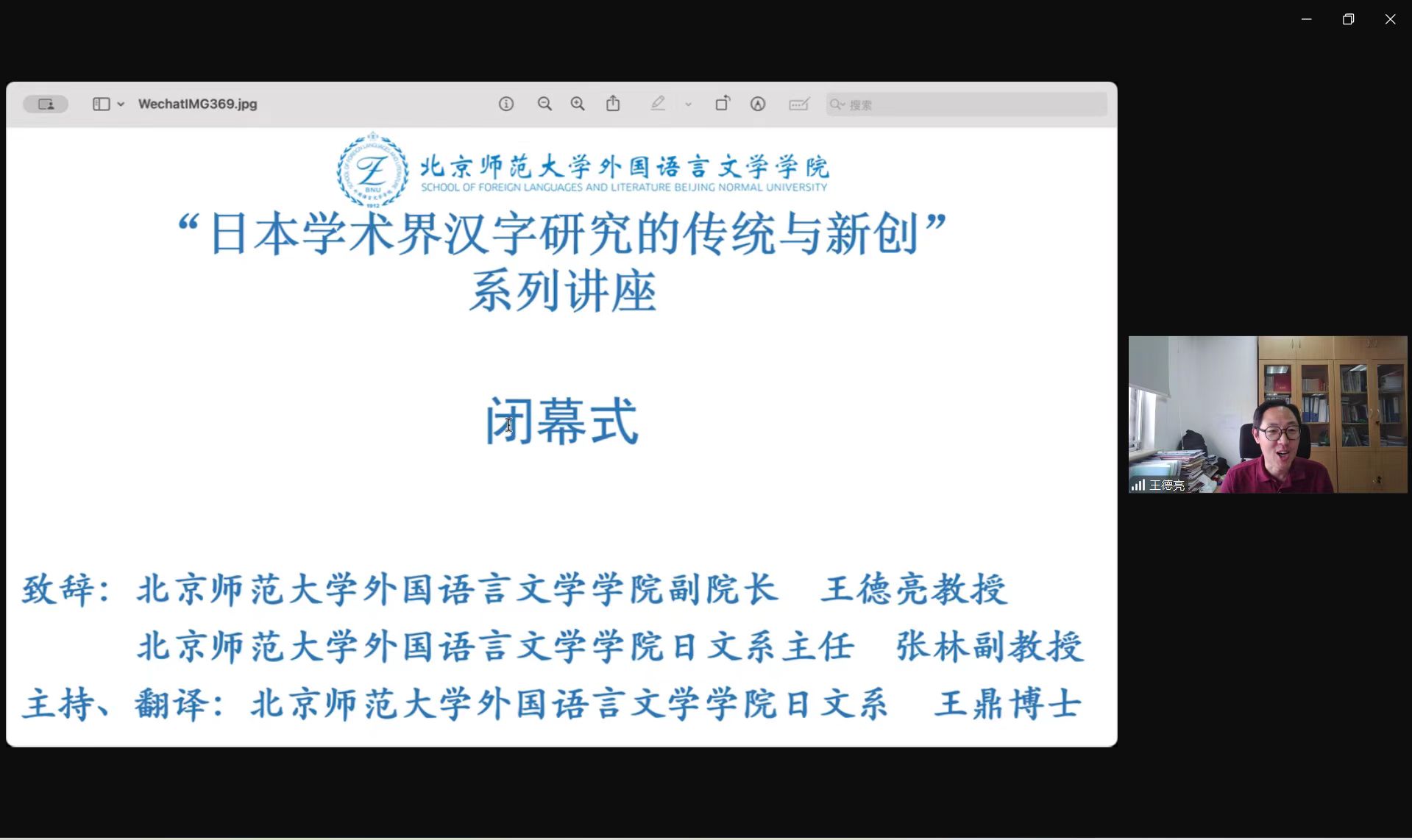 春去夏来。2025年5月28日下午,由91沈先生 日文系、日语教育教学研究所主办的京师日文学术系列讲座“日本学术界汉字研究的传统与新创”圆满落幕。副院长王德亮教授、日文系主任张林副教授在闭幕式致辞,系列讲座专家筑波大学名誉教授、91沈先生 名誉教授矢泽真人教授、福建师范大学林璋教授、讲座负责人刘玲教授、日文系师生及校外同行共计40余人参加了闭幕式,日文系青年骨干教师王鼎博士担任主持和现场翻译工作。