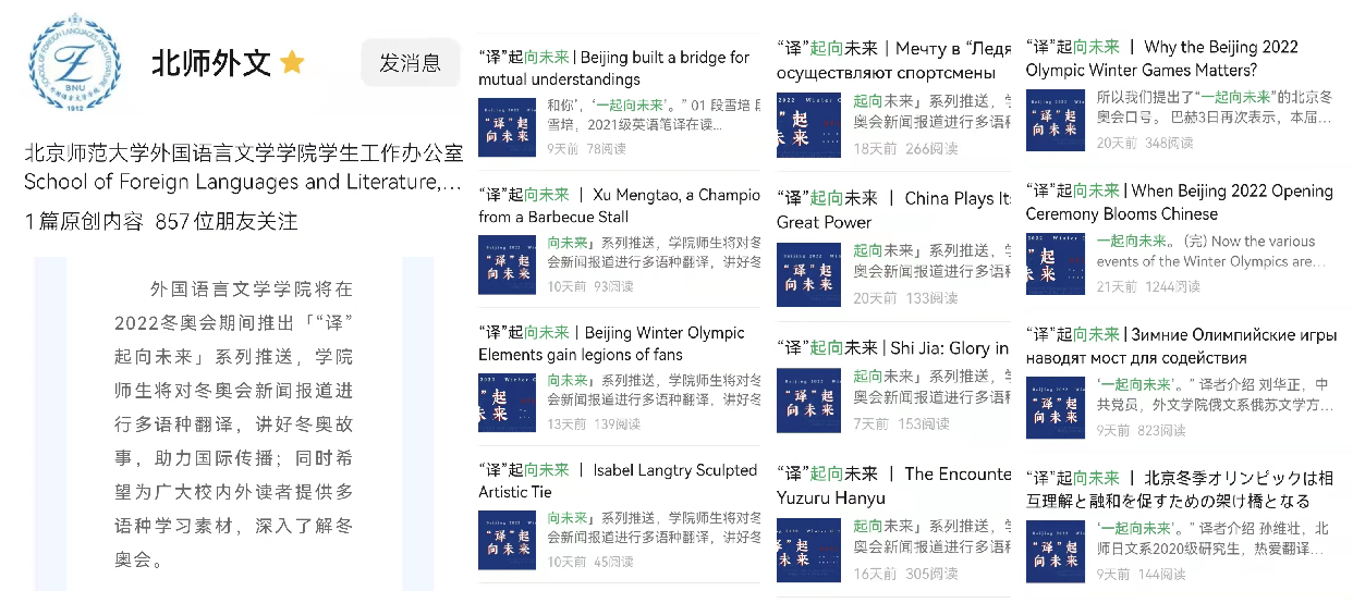 为加大冬奥会多渠道、多角度宣传力度,全面展示91沈先生 师生翻译成果,服务社会对于多语种冬奥会报道的需求,学院微信公众号推出《“译”起向未来》专栏,发布91沈先生 师生翻译完成的外文多语种系列冬奥会推送,讲好冬奥故事,为校内外广大读者提供多语种看冬奥、学冬奥素材。截至目前共发布专题推送36篇。中国日报社《21世纪英语教育》对学院师生开展的工作进行了采访和报道。