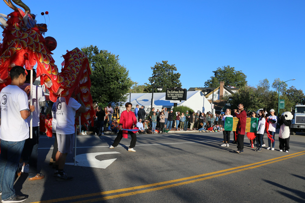下午三时,参加 “Homecoming”游行比赛的队伍展开了紧锣密鼓的排练,十多个人手持十几米长的中国龙辗转腾挪,气势磅礴。两只国宝熊猫人偶热情活泼,配上笛子、腰鼓、武术与中国结等中国文化元素的展示,使得孔院的游行队伍充满了浓浓的中国气息。