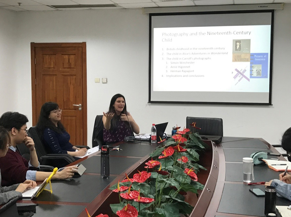 3月20日下午15:30,英文系邀请英国雷丁大学博士外籍教师Dr. Jessica Medhurst 为全院师生作了题为“Lewis Carroll Beyond Wonderland: Photography and the Nineteenth Century Child”的讲座。Dr. Jessica Medhurst以《爱丽丝漫游奇境记》的作者刘易斯·卡洛尔一幅儿童摄影作品为例, 从心理分析学、解构主义和文化分析视角展示了19世纪英国儿童文学的解读方法,同时也展示了20世纪和21世纪的文学评论家们是如何解读其作品中的儿童形象的。