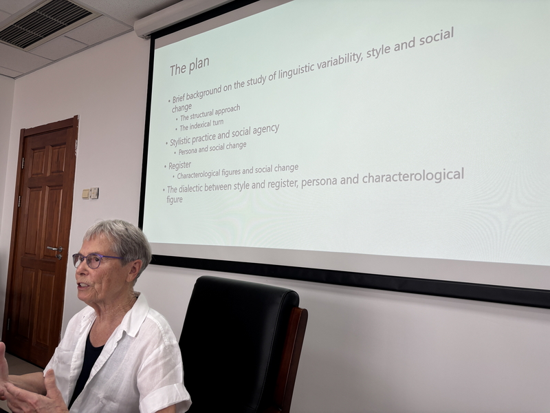 Eckert教授以学术史视角切入,系统梳理了语言学研究的范式转变:从传统的命题研究转向对非指称性符号的探索。她精辟地指出:“早期社会语言学执着于命题语法的变异分析,而语义学则困宥于真值条件的探究。主体性研究的兴起促使这两个领域在指示性和表达性话语的研究中找到了对话的契机。”这一见解引发了与会师生的思考。接着,Eckert教授通过鲜活的案例生动展示了情感如何成为社会意义建构的关键维度。在互动环节,与会师生就变异社会语言学的最新进展、语体实践与语言景观等前沿议题展开热烈讨论。