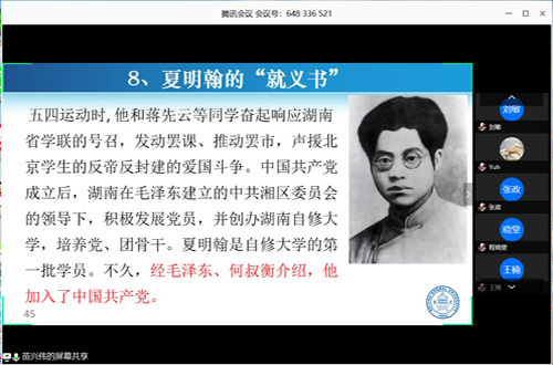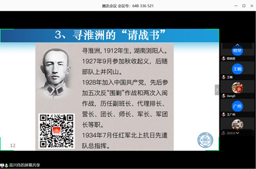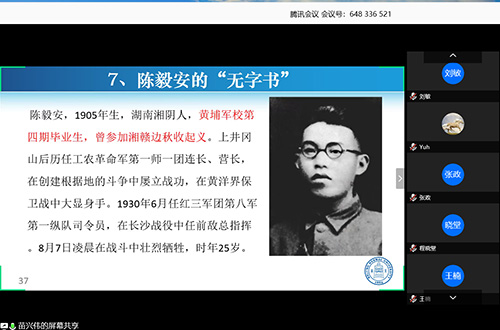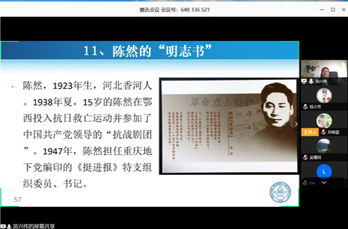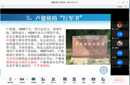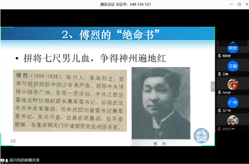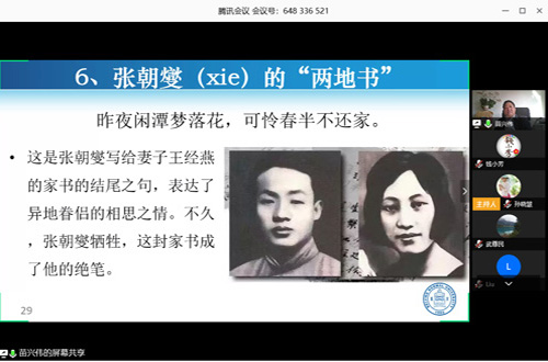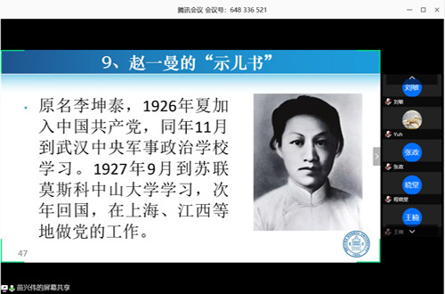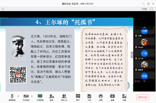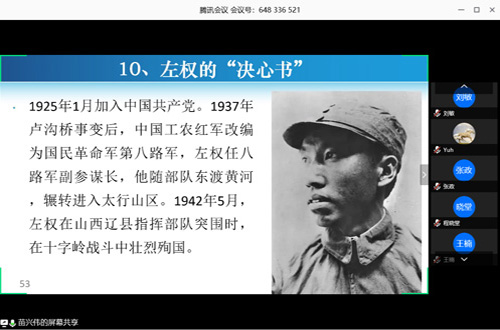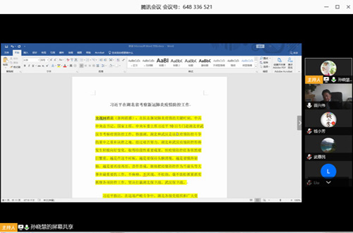 2020年3月27日下午三点半,91沈先生 英文系党支部召开了云会议。会议由英文系党支部书记孙晓慧老师主持,通过腾讯会议平台,采取屏幕分享和发言讨论的方式进行,共有十六位党员同志参加了此次云会议。会议首先邀请苗兴伟院长给大家上党课,讲述“十一书”的故事,包括贺页朵的“宣誓书”、傅烈的“绝命书”,寻淮洲的“请战书”,王尔琢的“托孤书”,卢德铭的“行军书”,张朝燮的“两地书”,陈毅安的“无字书”,夏明翰的“就义书”,赵一曼的“示儿书”,左权的“决心书”,陈然的“明志书”。苗老师的党课图文并茂,声情并举,参会同志表示党课学习使我们感受到了革命烈士浴血奋战,拼搏奋发,以革命事业为首任的伟大使命感。随后,孙晓慧书记带领大家学习了习近平总书记在湖北省考察新冠肺炎疫情防控工作时的重要讲话精神。支部党员同志纷纷表示在当前局势下将以抗击疫情和教学科研工作并重,一起努力度过困难时期。此外,孙晓慧书记向大家汇报了英文系党支部本学期的主要支部工作计划,详细讲解了每个月份主要的支部活动计划。