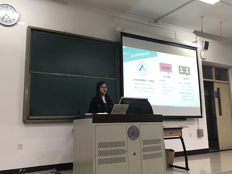 会议由孙晓慧老师主持。首先,来自英文系普通师范生的学生代表周密同学作了总结发言,周密同学分享了她在人大附中翠微学校实习的点点滴滴,在为其五周的教育实习工作中,她积极参与了学校组织的各种活动,和同学们建立了深厚的感情。随后,来自英文系的免费师范生代表肖欣欣同学分享了她为其近三个月的实习经验。肖欣欣同学总结了这三个月以来在教学、班主任工作、班会活动等方面的收获和经验,她感慨到:“虽然当老师非常辛苦,但是却有很多收获,受到了学生们的肯定,感觉非常幸福”。