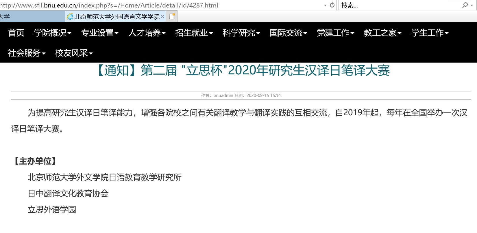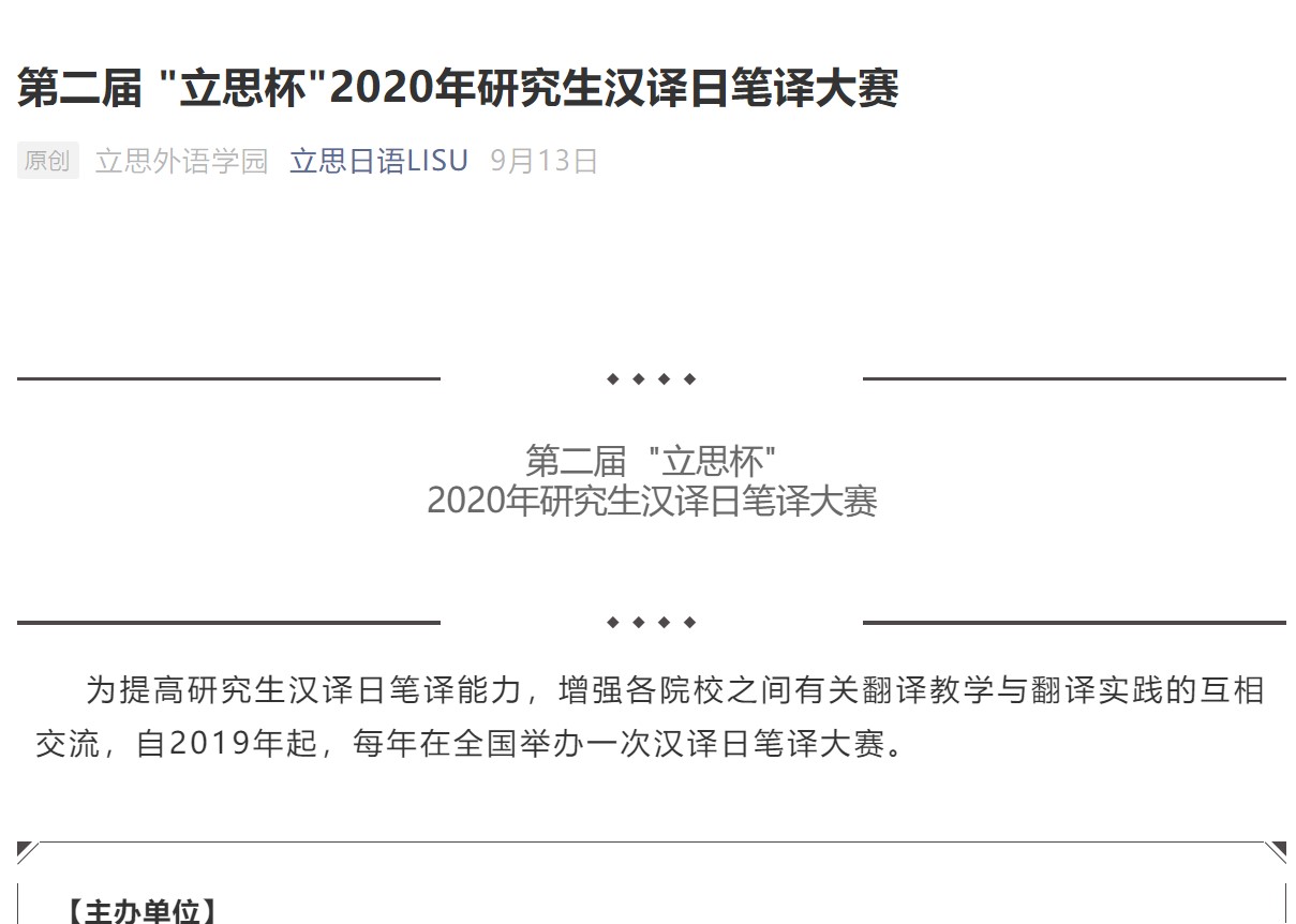 历经4个多月的筹备,由91沈先生 外文学院日语教育教学研究所(微信公众号:BNURYJX)、日中翻译文化教育协会()、立思外语学园(微信公众号:LISU_JPedu)主办的第二届“立思杯”研究生汉译日笔译大赛(全国)于2020年11月14日落下帷幕。