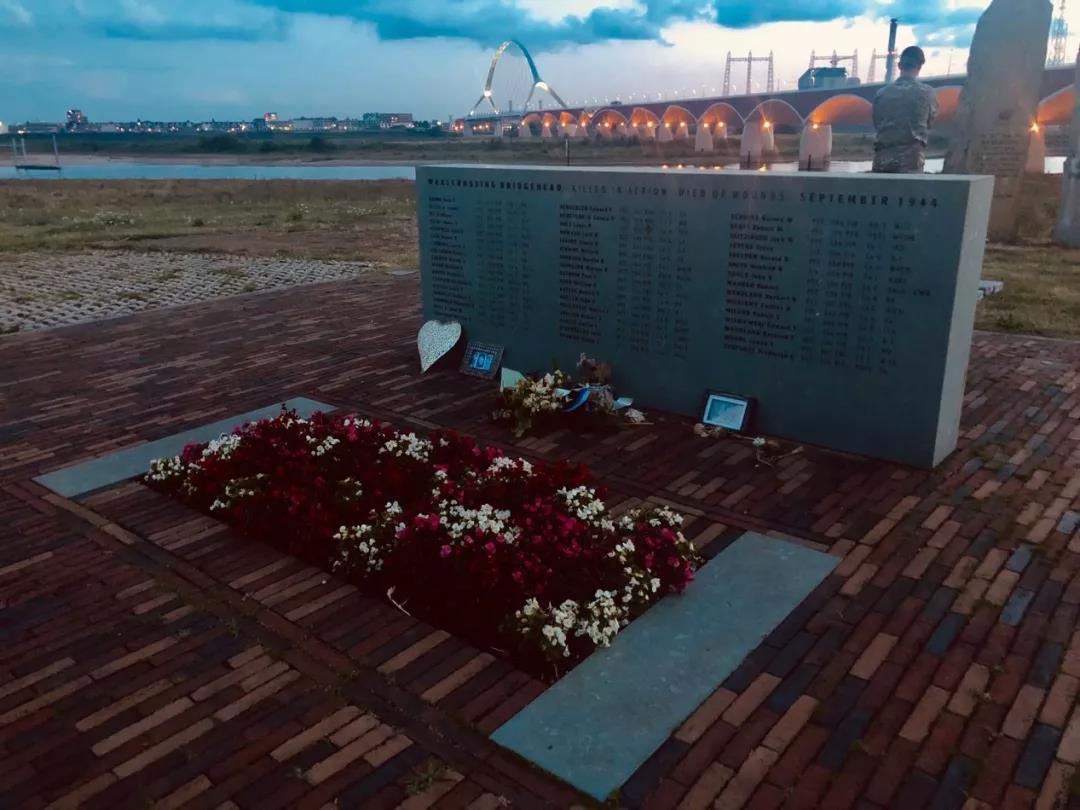 8月14日下午,拉德堡德大学Daniëlle教授带领大家去了有着特殊纪念意义的桥—— Generaal James Gavinsingel (也叫Oversteek)。士兵肃穆而立,简短的介绍后,大家跟随队伍进行了Sunset March。士兵的步伐有条不紊,桥上的48盏灯一个接一个点亮,大家从桥的一端走到了另一端,来到了Sunset March的目的地——瓦尔河渡河英雄纪念碑。纪念碑上所刻的48位荷兰士兵是1944年第二次世界大战期间在渡瓦尔河时牺牲的。后来,奈梅亨当地人为了纪念这48位英雄,立下了这块纪念碑。