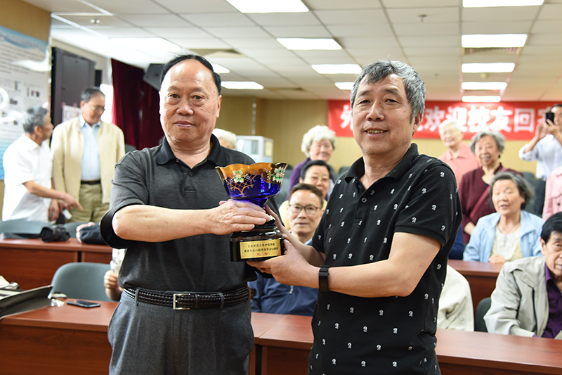 学院校友分会副秘书长代素霞介绍了与会的恩师及领导,校友总会副会长陈光巨教授、校友总会秘书长范文霞老师、当年的恩师简文光、刘宝英、易代钊老师、学院分党委书记刘娟出席本次聚会;院分党委书记刘娟致欢迎词并向校友介绍了学院近几年来的建设发展情况、取得的成果、面临的困难以及校友建设工作及学院设立基金情况,校友总会赠送了人走天涯,心系师大毕业50周年纪念章,学院为校友们准备了院刊、校友文化衫,以表达对校友们的欢迎和感激之情。与会校友忆往事,叙友情,谈感想,谢师恩,游校园,话当年,拍照片,留纪念,参观图书馆和校史馆,喜气洋洋,留连忘返,校友们感慨师大校园的变化,感慨外文学院的发展,对学院的前景给予了极大的期望,并设立校友基金,为学院的发展贡献自己的力量。校友们希望常回母校看看,经常和母校保持联系。