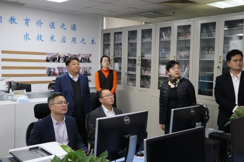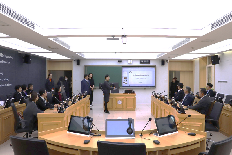 专家组首先走访了学院同声传译教学实验室和外语教育技术中心。学院副院长王楠详尽地向专家介绍了实验室建设成果、外语和跨学科能力实训流程、实践应用以及专业实习等情况,并重点汇报现代技术赋能教学与科研方面发挥的支撑作用和达成人才培养目标所提供的保障。任课教师朱虹宇老师展示了学生同声传译能力培养的教学成果。教育技术中心麻铁盾老师展示了教学资源开发的最新进展以及智慧课堂在实际教学中的应用情况。
