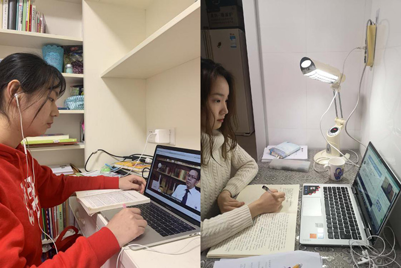 同学们虽身处各地,但“天涯若比邻”,大家在各自家里认真学习,和老师积极互动。