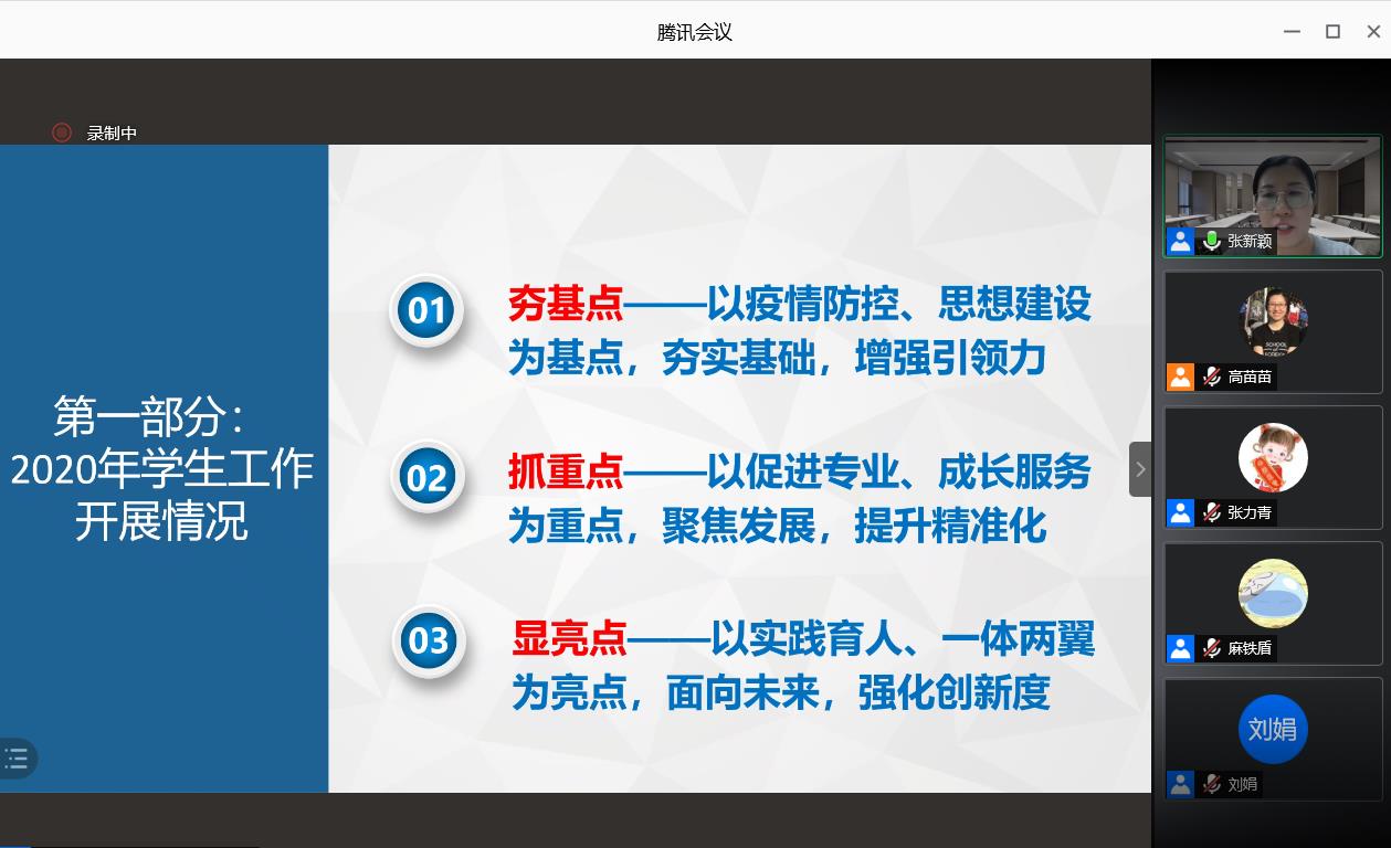 党委副书记张新颖从学生工作开展情况、对学生工作的思考、未来学生工作努力的方向三个方面汇报了学院学生工作的整体情况。