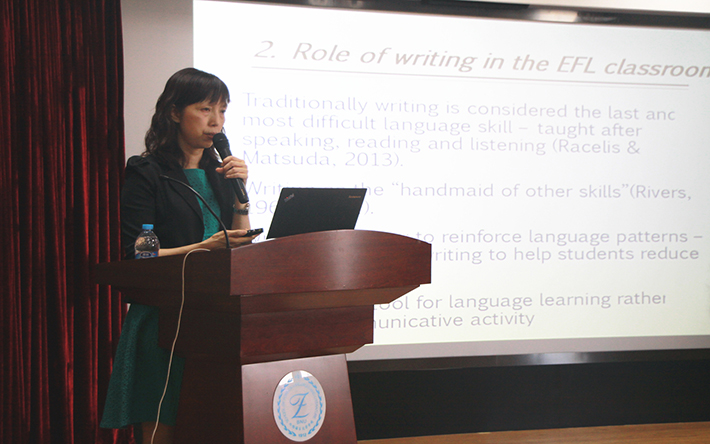Icy Lee教授作了题为“EFLWriting Teacher Education for the Future: Lessons from the Past, Visions forthe Future”的学术报告。她指出写作在香港的英语教学中没有得到足够重视;英语教师批改学生作文付出的大量辛苦工作与学生写作水平不理想之间存在矛盾。英语写作教师在身份认同方面也存在问题——甚至有老师自嘲自己是“批改作文的机器”,这反映出针对英语写作教师的培训也未得到足够重视。为了解决这一问题,她分享了自己的建议与实践经验。首先,应该拓展教师在写作以及写作教学方面的视野,帮助教师认识到写作是一个复杂的任务;其次,鼓励教师开展活动与学生分担写作任务与责任,如,同伴互评、制定写作目标以及反思写作等;再次,帮助教师认同其作为写作教师的身份,鼓励他们开展创新以及反思性实践,帮助他们建立学习共同体。同时,Icy Lee教授分享了她在教授写作课程的一些经验。其中,让学生通过“digitalstory”进行写作的做法让人耳目一新,深受启发。最后,她指出,在21世纪的教学中,教师应该重视评价在写作教学中的作用,通过课堂写作评价促进学生学习,并提高教学效果。