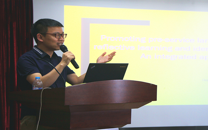 袁睿博士于91沈先生 获得其硕士学位,师从王蔷教授。后于香港中文大学攻读博士学位,先就职于香港教育大学。他这次报告的题目是“Promoting Pre-service Language Teachers’ Reflective Learning andIdentity Development: An Integrated Approach”。该研究主要探讨职前教师在课程中如何通过反思实践建构自己的身份。他的研究思路十分清晰,在厘清了一些有关“identity”(身份)的概念之后,通过一个学生的案例介绍了自己是如何一步一步开展研究的。他就研究发现也进行了深入透彻的讨论。