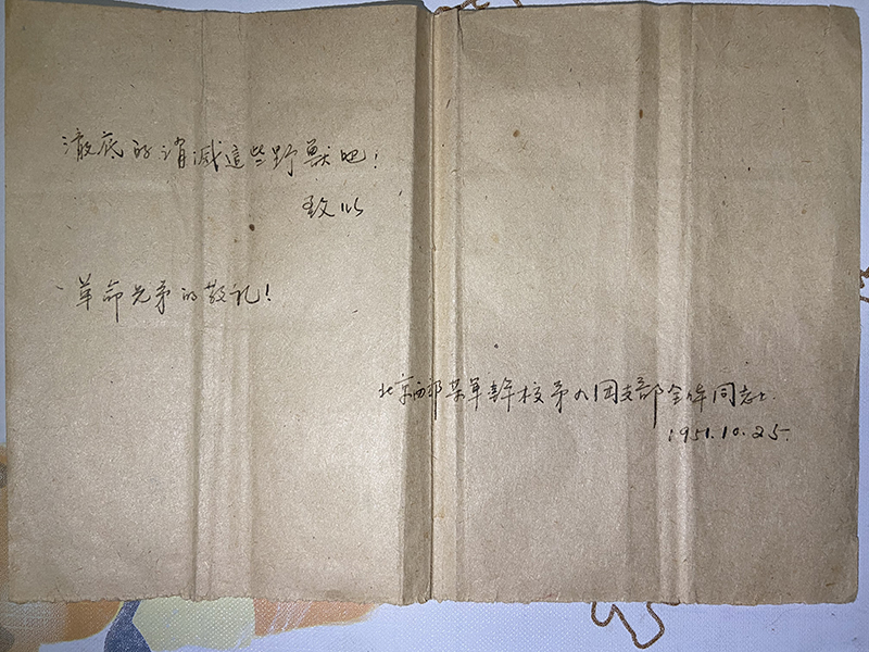 郭美凤老师今年已经92岁高龄,但身体仍然非常康健,独居的她热情地欢迎了我们的到来。2020年是中国人民志愿军抗美援朝出国作战70周年,刚一坐下,郭美凤老师拿出了珍藏七十年的书信。其中一封是青年时期的郭老师代表班级西部某军干校第九团支部全体同志,向中国人民志愿军写的书信,书信中表达了郭老师这一批青年团员对“志愿军大哥”高度的爱国主义精神的崇敬和向“志愿军大哥”学习的决心。而另外一封信,是中央人民政府人民革命军事委员会技术部干部学校,于1951年写给郭美凤老师的。从书信的内容中可以看到,在建国初期贫困的年代,郭老师从革命利益出发,不计个人得失,向学校捐出了二十七万元的捐款。除此之外,郭老师也向我们讲述了许多关于她的故事,我们感慨于郭老师经历丰富的同时,也对郭老师方方面面表现出的爱国情怀而肃然起敬。从筹集款项为中国人民志愿军订阅文化精神食粮《中国青年》,到慷慨解囊捐出家族遗产,再到内心对中国的归属而坚持留在国内,郭老师不仅是英语老师,也是我们的精神文化老师,是我们学习的榜样。