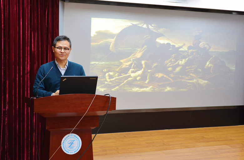 张晓东老师首先介绍了俄罗斯导演索科洛夫的生平、代表作、导演在俄罗斯以及世界影坛的地位,并向大家解释了电影名称“FRANCOFONIA”的含义。《梅杜萨之筏》(The Raft of the Medusa)是法国艺术家泰奥多尔·籍里柯于1819年创作的油画,在电影中反复出现。张晓东老师介绍了这幅画作的历史背景,该画作的思想在当今社会的映射及其与电影的内在联系。在这之后,张晓东老师讲述了俄裔法籍思想家、“欧洲共同体”理论的奠基人亚历山大۰科耶夫。据张晓东老师介绍,科耶夫家族具有很高的艺术修养,与中国有很深的渊源,科耶夫本人也曾到访过中国,拍摄过许多照片。