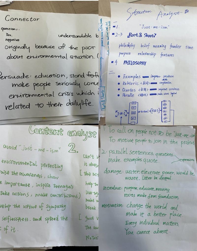 韩松老师采取“阅读圈”的方式引导学生加深对文本的理解,帮助学生将显性知识转化为隐形知识。在四人一组的阅读圈活动中,每个组员都有各自的任务角色,如内容分析者、态度分析者、结构分析者等,通过构建学生间的信息差及组内组间交流,学生得以实现深度学习。