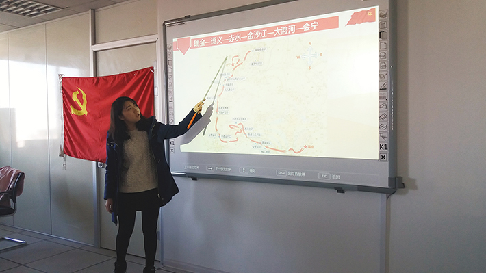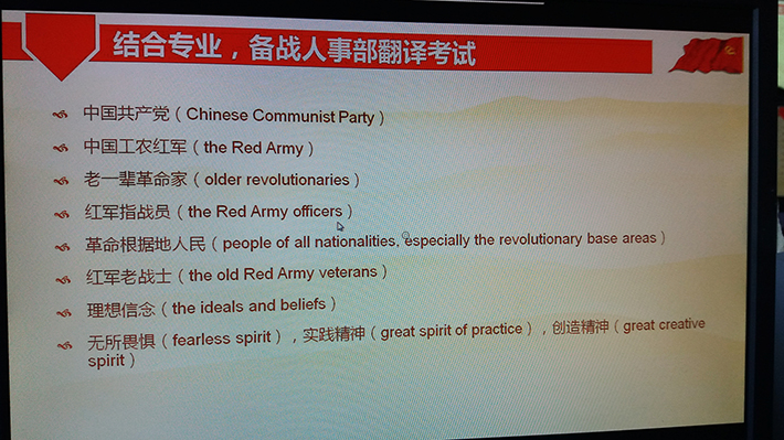 活动第二项,学习习近平总书记在纪念长征胜利80周年大会上的重要讲话。宣传委员于欢同志首先为大家介绍了红军长征的背景、路线、经历的战役及胜利的意义,并且结合专业特点,对长征特色词汇的英译做了介绍。随后,大家一起观看了学习视频,包括习近平总书记关于长征胜利的讲话、用沙画生动演示的长征历程、对104岁参加长征老红军的真实采访,还有《长征》纪录片的选段。观看过程中,各位党员无不被红军战士克服艰难,顽强拼搏的精神感动,有的甚至还流下了热泪。