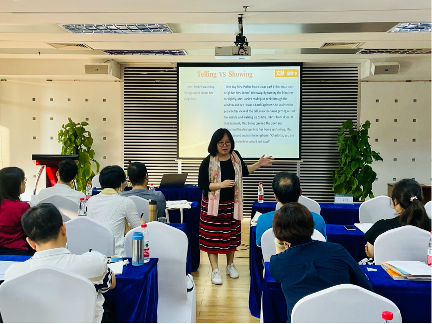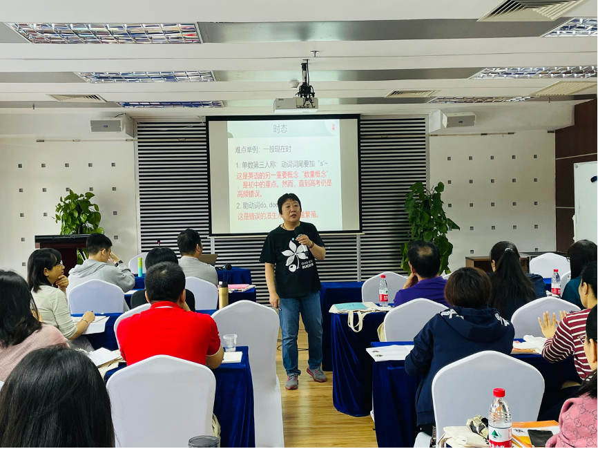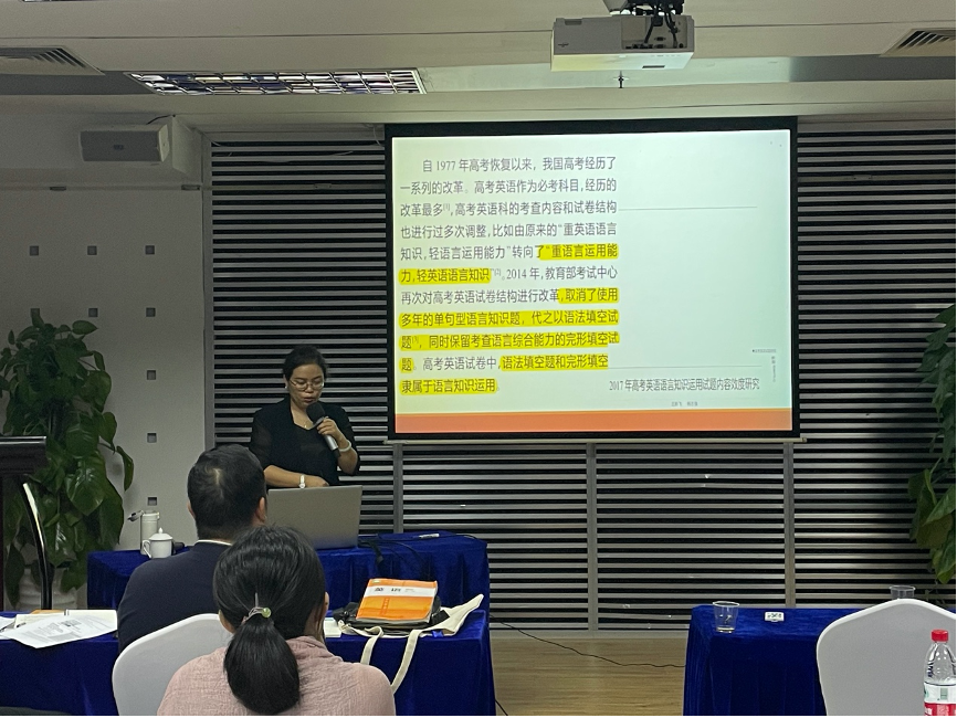 晚上,钱小芳副教授带来主题为“高考中语法考核方式、特点与备考”的讲座。钱老师在讲座中归纳了高考语法考查内容,并向各位老师详细讲解语法教学策略,同时,也分享了许多语法课教学活动,让各位老师亲身体会不同的语法教学活动之间的差异。