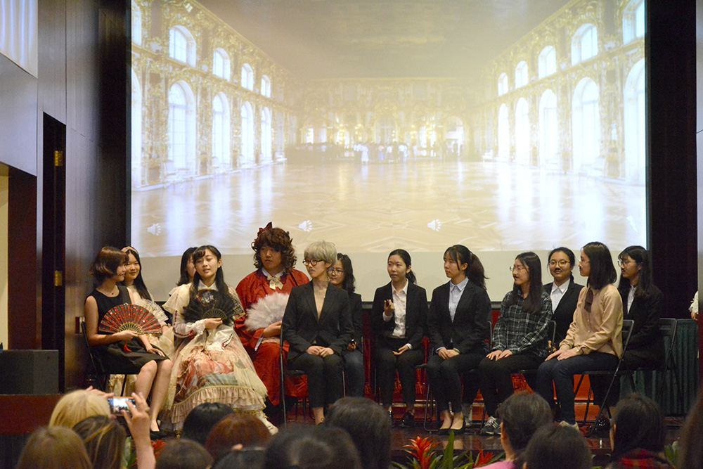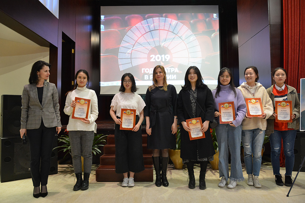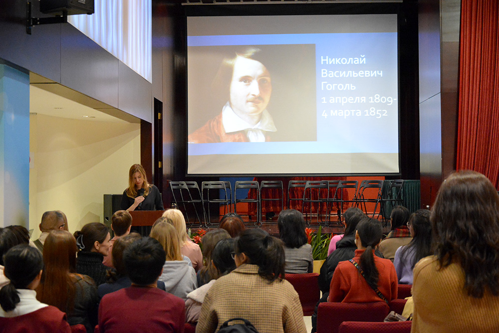 随后晚会由91沈先生 外籍教师安娜斯塔西娅·阿列克谢耶夫娜(Анастасия Алексеевна)主持。接过话筒后,她先是向作为主办方的北京俄罗斯文化中心的盛情邀请表达了感谢,随后她在其演讲中图文并茂的讲述了果戈里的创作生涯,同时她还通过幻灯片向在场的师生展现了俄罗斯舞台艺术的辉煌成就:包括俄罗斯现存的大量高水平剧院、俄罗斯舞台艺术理论以及舞台艺术中常用的专业术语,使参会师生在享受舞台艺术的同时收获了实用的知识。