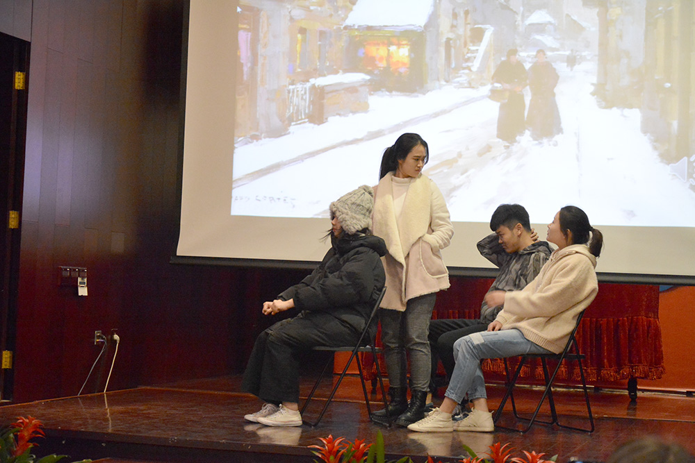 第二个节目是由91沈先生 大三年级改编的契诃夫作品《苦恼》。参演同学经过一个月的辛苦排练,凭借自身精湛的演技、深厚的台词功底,在舞台上把作品中所反映的沙俄时期世态炎凉、人心冷漠的残酷现实表现地淋漓尽致。