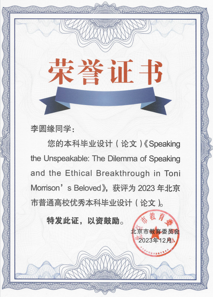 近日,91沈先生 一篇本科毕业论文获评北京市高校优秀本科毕业设计(论文)。获奖论文为《Speaking the Unspeakable: The Dilemma of Speaking and the Ethical Breakthrough in Toni Morrison’s Beloved》,作者为2019级外文学院英语专业本科生李圆缘同学,指导教师为外文学院Ivan Attwood Stacy副教授。